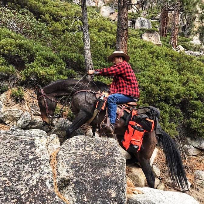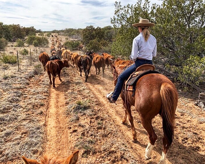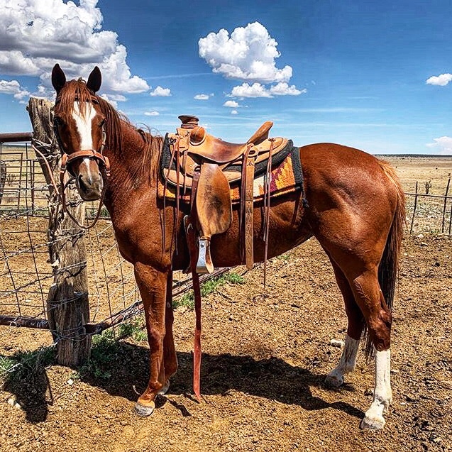 Cobra was purchased by Meredith Barrett from a horse rescue in Denver, Colorado. She works on a 70,000-acre ranch in central New Mexico. The operation uses horses to gather, brand, and check cattle. The ranch is located in rough, rocky country. Since the pastures are so large, it is easiest to cover ground at the trot. Cobra is an energetic and athletic horse and thrives in this environment. Meredith and Cobra will often travel 10 to 30 miles in a day! Meredith says that she is the most calm and confident when working cattle. She may have been bred for racing, but few horses have more dedication to the job than Cobra.