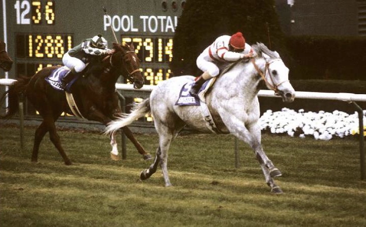 In 1980, Cozzene was foaled in Florida. This beautiful gray was bred and owned by John Nerud. He was by leading French sire Caro and out of Ride the Trails, by Prince John. He had a short back, sloping shoulder, and keen expression. Cozzene won three races his three-year-old season and continued to get better with age. At four, he won the Cliff Hanger Handicap and was third in the Breeders’ Cup Mile. He had his best season at age five, winning the Oceanport Handicap, Longfellow Handicap, and Breeders’ Cup Mile. He earned the 1985 Eclipse Award for Champion Grass Horse. In total, he stated 24 times, won ten races, and earned $978,152 on the track.