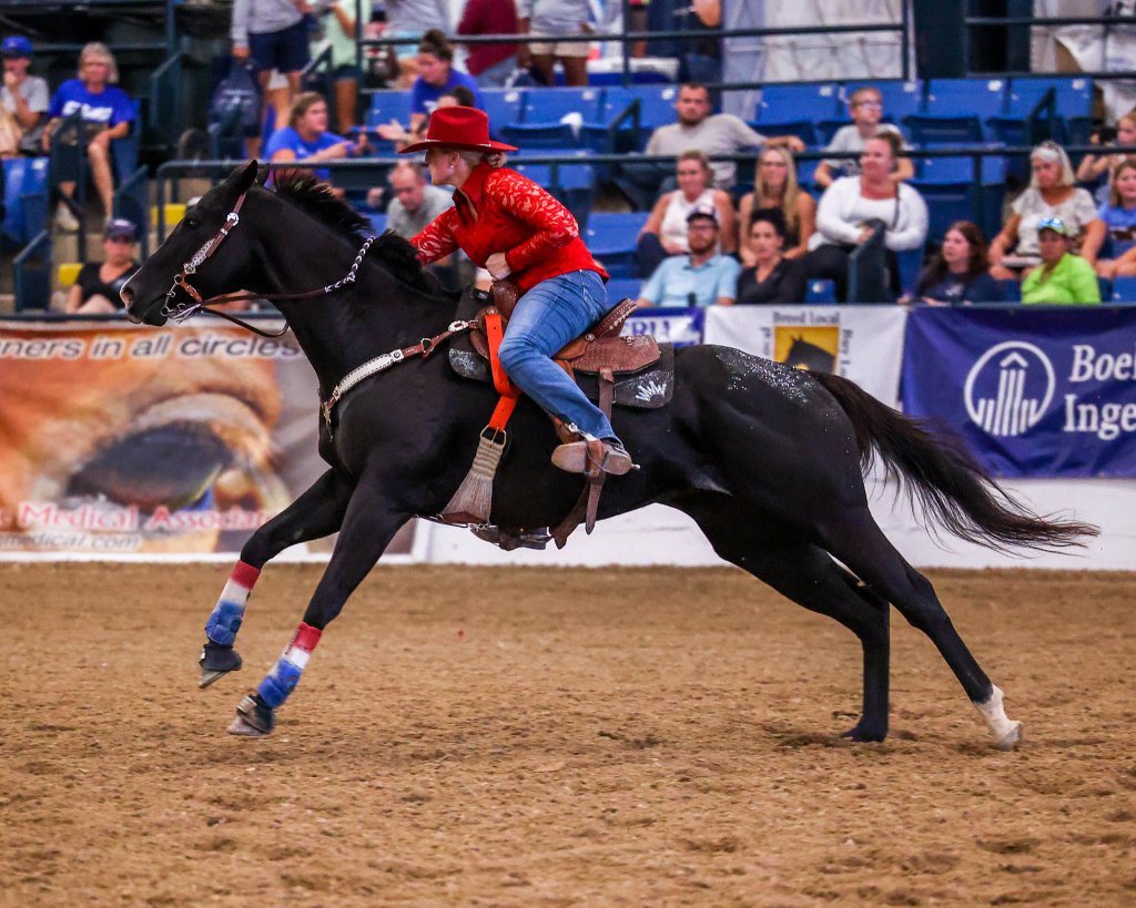 Christy Drent and Justa Jester won the 4D Average at the T.I.P. Barrel Racing Championships. Justa Jester is an eleven-year-old Michigan-bred gelding by Comedy Show and out of Sheza Match, by Matchlite. He made 11 starts, won three races and earned $26,029 on the track. His three wins were at Hazel Park in Michigan. Since he retired from racing in 2015, Justa Jester has placed well at IBRA and NBHA barrel races.