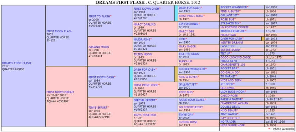 Flash is a 2011 gelding bred in Washington by Quarter K Inc. He is by First Moonflash and out of First Down Dream, by First Down Dash. He made one start at Lone Star Park in Grand Prairie, Texas, finished sixth, and earned $50 on the track. Prominent Thoroughbreds in his pedigree include Three Bars, Find a Buyer, Tilt The Odds, Pukka Gent, Raise Your Glass and Hijo Beauty.