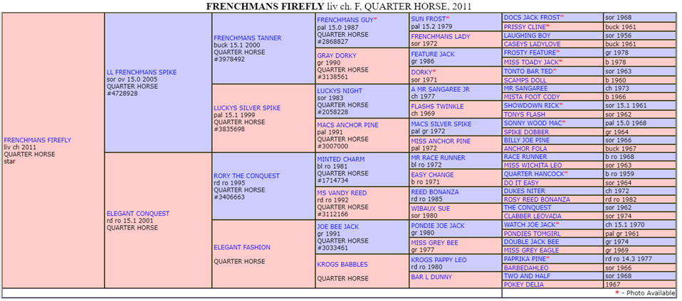 Fire Fly is a 2010 gelding bred in Wyoming by Robert and Peggy Welsh. He is by Frosty Frenchman and out of Princess Bar Dash, by Hot Dasher. Prominent Thoroughbreds in his pedigree include Three Bars, Rocket Bar and Find a Buyer.