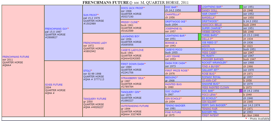 Missy is a 2011 mare bred in South Dakota by Gary Westergren. She is by Firewater Frenchman and out of Frenchmans Bo Dashus, by Royal Quick Dash. Prominent Thoroughbreds in her pedigree include Three Bars, Find a Buyer and Beduino.