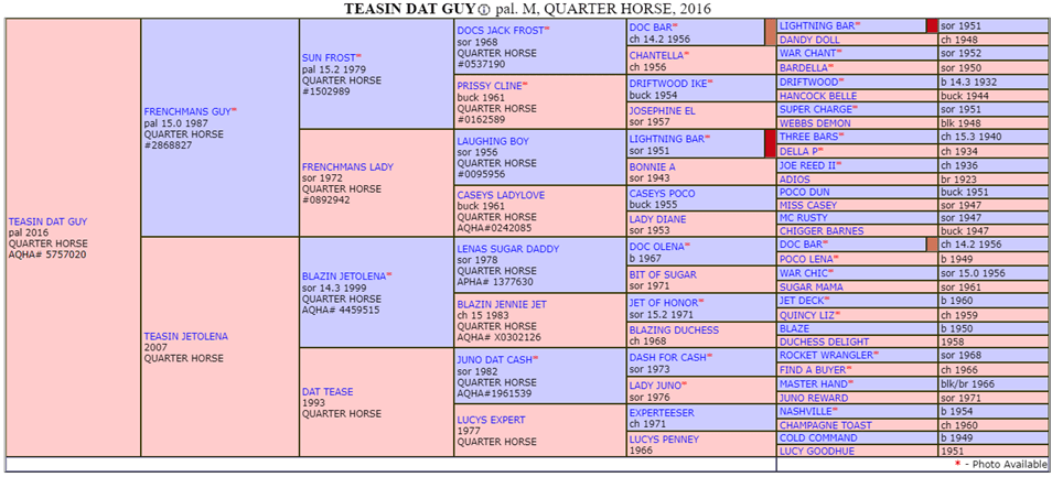 Teasin Dat Guy is a 2016 mare bred in Minnesota by Katie Lindahl. She is by Frenchmans Guy and out of Teasin Jetolena, by Blazin Jetolena. Prominent Thoroughbreds in her pedigree include Three Bars, Blazing Duchess, Find a Buyer, Master Hand, Experteeser and Cold Command.