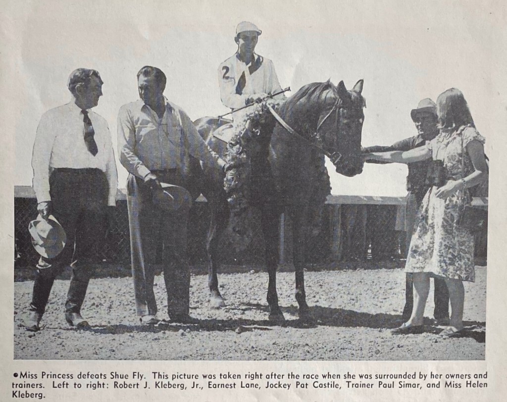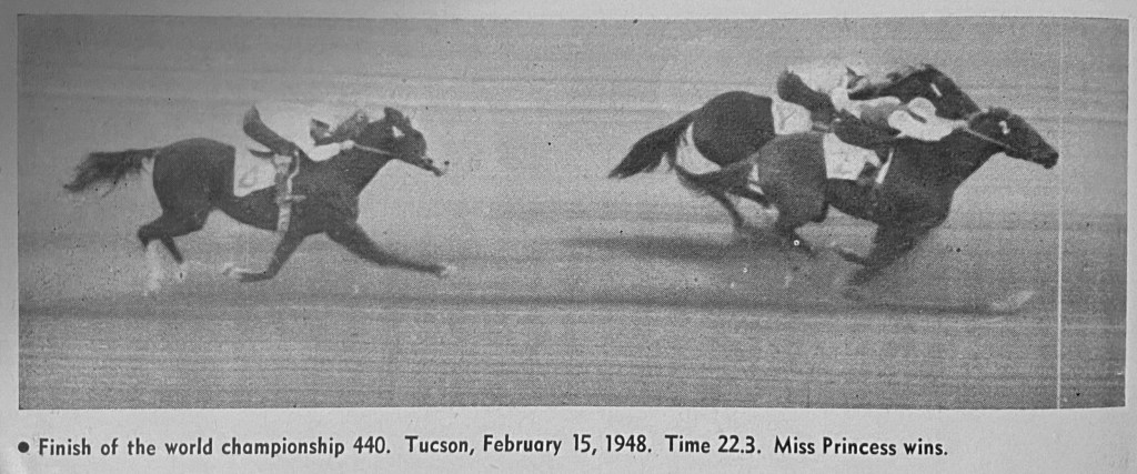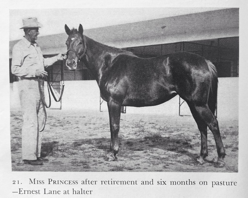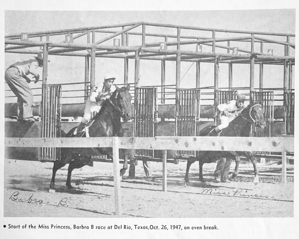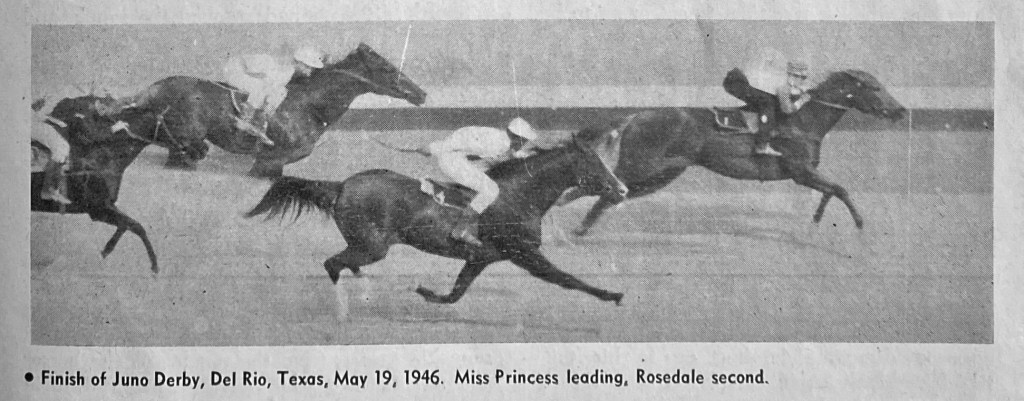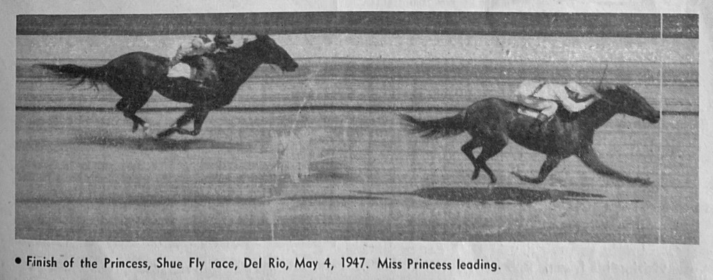 At the end of the war, Kleberg shipped Woven Web back to the United States and contacted Earnest Lane. Lane would frequently lease Kleberg’s sprinters to prove them on the short tracks. Woven Web was turned over to Lane and her name became “Miss Princess” when she raced against Quarter Horse company. With Lane and trainer Paul Simar, Miss Princess won the Juno Derby, Eagle Pass Championship and set two new track records at Ft. Duncan Racetrack. For her accomplishments, she was named the 1946 World Champion Quarter Running Mare and World Champion Quarter Running Horse. Kleberg was now certain that she was ready to beat Shue Fly.