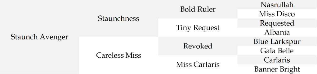 Other Thoroughbred stakes winners by Staunch Avenger include Silent Reflex, Mineisthesunit, Avenging Gossip, Avenger Mist, Avenger’s Bouquet, Staunch’s Annie, Bold Etching, Sudden Avenger, Never Late Mate, and El Tigris. His Quarter Horse stakes winners include Virgil Vengeful, Daylight Avenger, Stormin Avenger, Revengeful, Vengeful Virgin, Liz Smith, Straight Forward, Mighty Avenger, Avengers Promise, and Forward Bingo Lady. In total, Staunch Avenger sired 578 Thoroughbreds, 284 Quarter Horses, and a handful of Appaloosas and Paints in 19 foal crops. His progeny included 396 race winners, 106 Racing ROM-earners, 22 stakes winners, five graded stakes winners, and five Superior Race Award earners, with earnings of $10,036,971 on the track.
