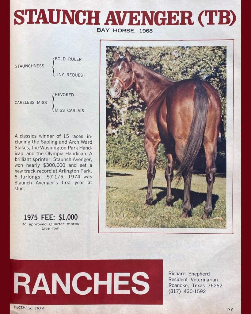 Staunch Avenger was foaled in Kentucky on March 16th, 1968. He was bred by Charles Heekin. Staunch Avenger was by multiple stakes winner Staunchness. Staunchness, a son of the great Bold Ruler, was the sire of several strong sprinters including Over Arranged, the grandsire of Deb Mohon’s great NFR barrel horse Special Agreement, aka “Brown.” Staunch Avenger had connections to the western industry on the topside of his pedigree and class on the bottom. His dam, Careless Miss, was by Revoked and out of Miss Carlaris, by the British stallion Carlaris. Careless Miss produced five winners, including Our Sonata, Misgiving, Careless Note, and Fantastic Miss. Staunch Avenger was her most successful foal.