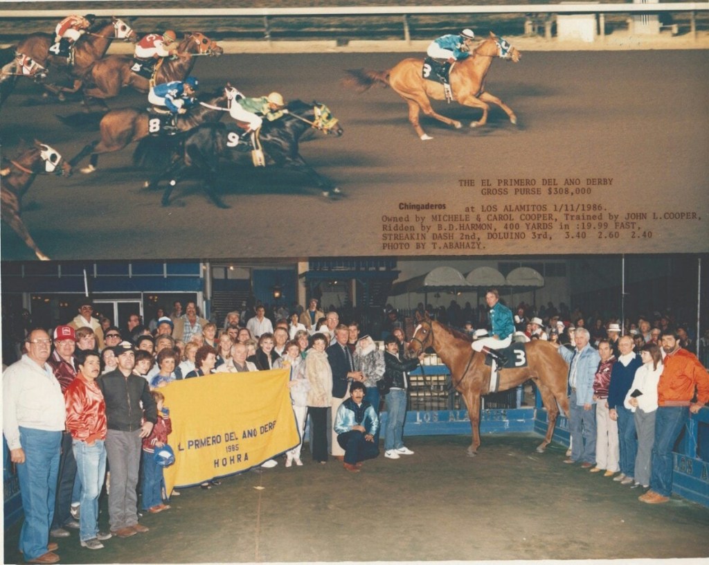 Chingaderos, a sorrel gelding by Beduino and out of Mama Said Win, by Ettabo, became famous for his rivalry with four-time champion, Gold Coast Express. Chingaderos won 23 races and earned $853,404 on the track. His biggest wins were the Golden State Futurity, El Primero Del Ano Derby, Los Alamitos Derby, QHBC Sprint Classic, Chicado V. Handicap, St Nicholas Express Handicap, Z Wayne Griffin Director’s Stakes, Kaweah Bar Handicap, Orange County Invitational Handicap, Mr California Handicap and California Breeders Championship. Chingaderos was awarded the 1988 and 1989 AQHA Racing Champion Aged Gelding titles.