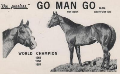 Go Man Go earned his third World Championship title after lowering his track record at Ruidoso to 21.800 seconds in the 1957 Maturity Stakes. That time would stand as the world record for several years. He continued racing until he was six years old. He retired with a record of 47 starts, 27 wins, nine seconds, three thirds and $89,150 in earnings. As a sire, Go Man Go was outstanding. He sired seven Champion Quarter Running Horses – Goetta, Go Josie Go, Dynago Miss, Steam To Go, Duplicate Copy, Whataway To Go and Go Derussa Go. His get earned $7,631,518 on the track. He also sired four Superior Performance Award-earners and two Superior Halter Award-earners. His top performers were Anaman, Go Andy Go, Go Lad Go, Go Lindy Go, Go Mobile, Mr Meyers, Shanghai Pierce and Story Man. Go Man Go passed away in 1982 and was inducted into the AQHA Hall of Fame in 1990.