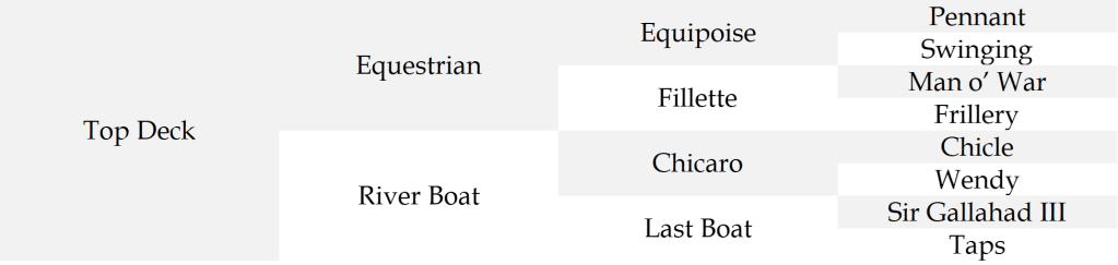 Top Deck was foaled in 1945. He was by Equestrian, a race-winning son of Equipoise. Equipoise won 29 races including the Metropolitan Handicap, Arlington Gold Cup and Whitney Stakes. He was the 1930 Champion Two-Year-Old Colt, 1932, 1933 and 1934 Champion Handicap Horse, and 1932 and 1933 Horse of the Year. After just four seasons at stud, Equipoise died at the age of ten due to an intestinal infection. His offspring were extremely successful on the track. Most notably, Shut Out, won the 1942 Kentucky Derby and Belmont Stakes. Equipoise posthumously became a leading sire in North America. He was inducted into the U.S. Racing Hall of Fame in 1957.