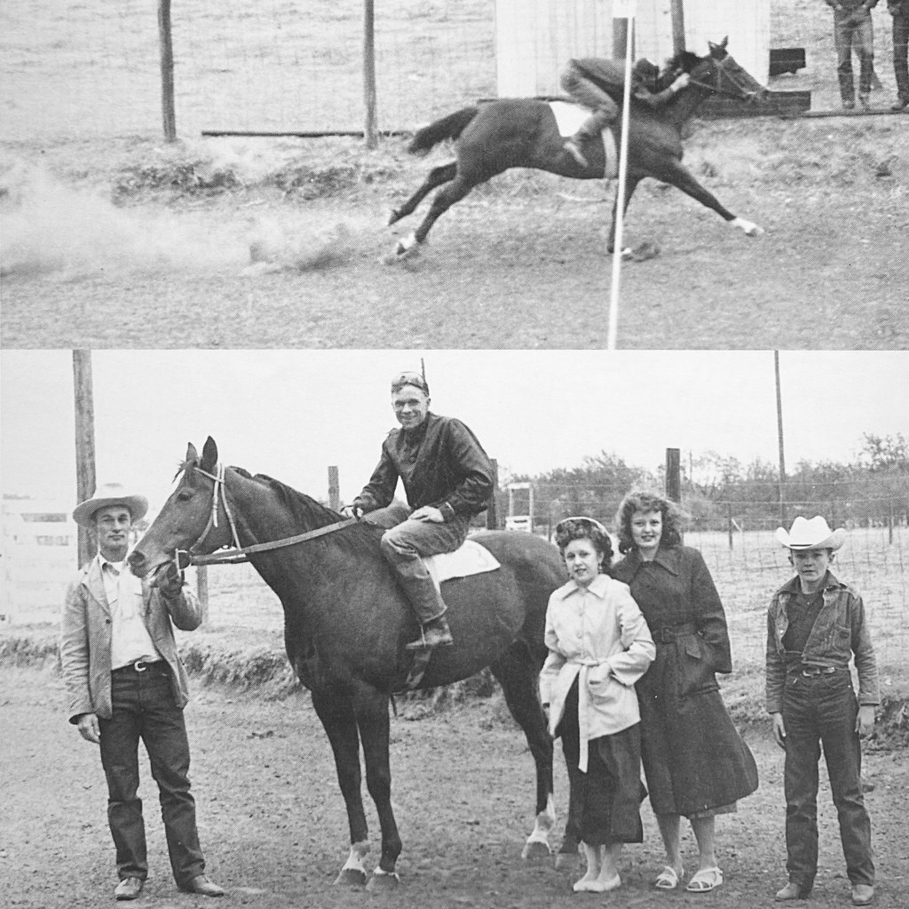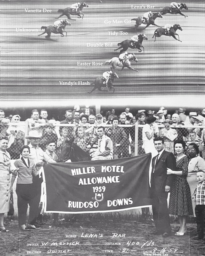 “Lena’s Bar wasn’t a big mare,” Merrick told Frank Holmes, author of Wire to Wire: The Walter Merrick Story. “but she was a well-made, pretty thing.” For five years, that pretty mare dominated tracks across New Mexico. In 1957, she won four starts, earned her AAA rating, and equaled the track record at Albuquerque for 400 yards in 20.300 seconds. As a four-year-old, Lena’s Bar won four more races including the C. L. Maddon’s Bright Eyes Handicap and Buttons and Bows Stakes. She also placed third in the Shue Fly Stakes.
