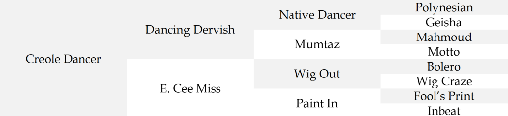 As with many Thoroughbred sires of Quarter Horses, Creole Dancer was more successful as a broodmare sire. His daughter Bicoastal produced two graded stakes winners – Coastal Memories and Bens Coasting. Coastal Memories won the Gr. 1 Heritage Place Futurity and Bens Coasting won the Gr. 2 Sam Houston Derby. Furthermore, Bicoastal produced Gonna Move You, the dam of Gr. 1 Ruidoso Derby winner Jess Move You and 1D barrel horse Tres Move You. Dancing Turf, another great daughter of Creole Dancer, produced stakes finalists Lindsayshadowdancer, Maddies Special Turf, Turf Cash, and Turfinureyes.