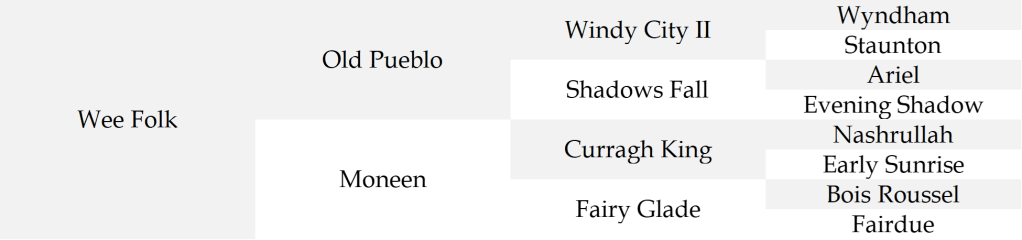 Moneen, the dam of Wee Folk, was bred in California by Edwards M. Goemans. She was by Curragh King and out of Fairy Glade, by Bois Roussel. Moneen made thirteen starts and was a winner. She produced six foals for Jelks including race winners Sara Moneen, Windcutter, King’s Shadow and Mountain Morn. She was later sold to Florida and produced seven more race winners – Bunny Dory, Swift William, Fleeting Fairy, You’re So Good, Moolahs Image, Lil Bit O Soul and Kaseen. Glory Be Good, a full sister to Wee Folk, produced Rubarb Jones, a graded stakes winning Quarter Horse. Wee Folk was Moneen’s most prolific son.