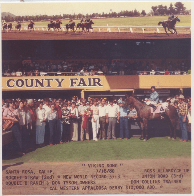His Appaloosa offspring are not included in those statistics. In addition to Thoroughbreds and Quarter Horses, Vikingson also sired 22 ApHC-registered foals that earned $264,600 on the track. His most successful Appaloosa foal was Viking Song, a bay filly with a white blanket. Viking Song won the Cricket Bars Derby, Oklahoma Maturity, California Appaloosa Derby, Fresno Handicap and California State Fair Marathon. She went on to produce eleven ApHC-registered foals that earned $92,697 on the track. Viking Song was inducted into the ApHC Racing Hall of Fame for her accomplishments.