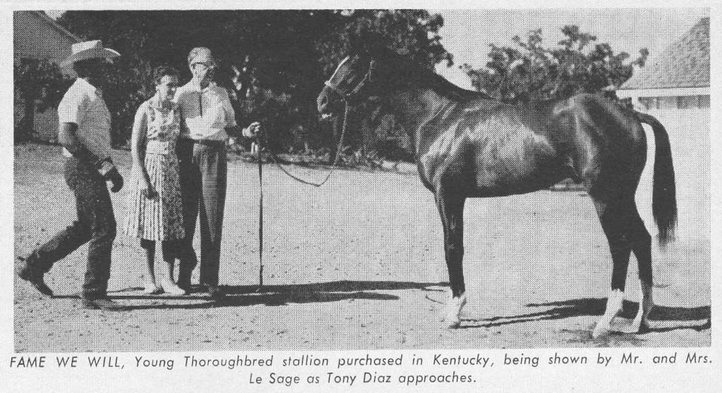 Fame We Will was purchased by H. Fame LeSage and his wife Irene LeSage as a yearling. Fame LeSage was from Los Angeles, California. He served as a lieutenant in the Army infantry during World War I. When he returned to California, he founded the Industrial Association of San Fernando Valley. Fame was also on the advisory board of St. Joseph’s Hospital in Burbank and later Holy Cross Hospital in San Fernando. His hobbies were represented by his long-time memberships with the Los Angeles County Farm Bureau, California Thoroughbred Breeders Association and Pacific Coast Quarter Horse Association.
