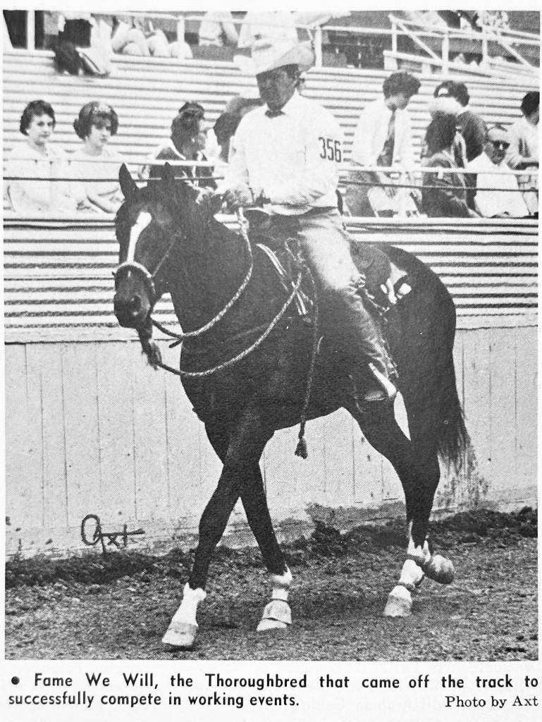 Tony had plenty of good horses to show. This may be why he felt comfortable enough to experiment with different bloodlines. In 1960, he decided to find a Thoroughbred to train for stock horse competitions. He went to Kentucky and felt the mouths of several yearlings. He selected a bay colt because he had good, smooth bars. Fame and Irene named the colt Fame We Will. He covered six mares as a two-year-old and went to the track the following year. According to Equineline, Fame We Will made twelve starts and earned $1,040 in official races. He was far more successful in the show pen.