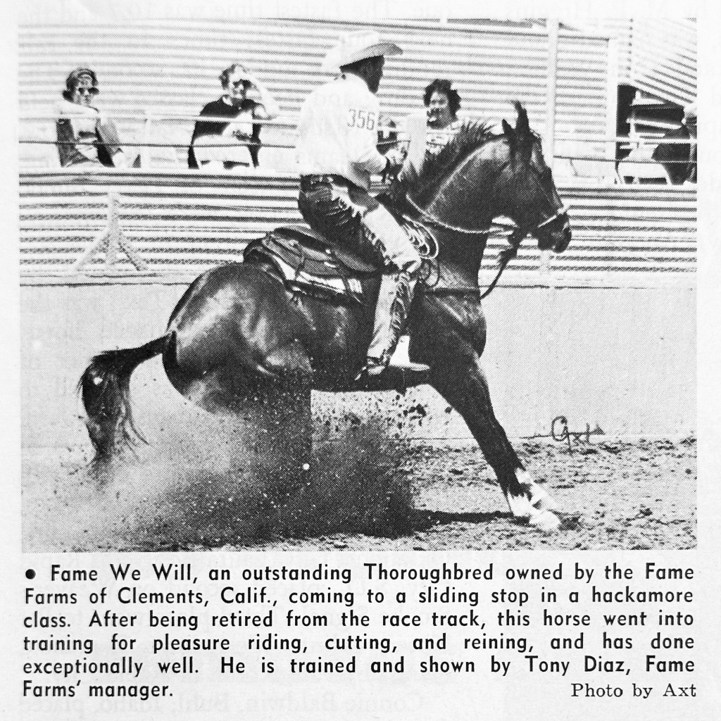 Tony trained Fame We Will for western pleasure, reining and cutting. The October 1964 issue of Western Horseman featured a photo of Tony and Fame We Will performing a sliding stop in a hackamore. “With Tony’s easy hands,” wrote photographer and artist Darol Dickison, “he made reining runs on this long, tall, smooth-moving stallion that were music in motion.” Tony and Fame We Will appeared in Western Horseman again the following year competing at a stock horse show and cutting cattle at Fame Farms. Although he was an unconventional western mount, Fame We Will did exceptionally well at stock horse shows across Southern California.