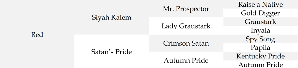 Red was foaled on April 4th, 1994. He was bred by Thomas W. Bachman at Pegasus Ranch in Petaluma, California. Red was by Siyah Kalem, a graded stakes placed chestnut stallion by Mr. Prospector and out of Lady Graustark, by Graustark. Siyah Kalem sired stakes winners Both Ways, J J Wantsthefront and Taurus Forus. Satan’s Pride, the dam of Red, was by Crimson Satan and out of Autumn Pride, by Kentucky Pride. She won fifteen starts including the Michigan Futurity, Azalea Stakes and Mahmoudess Stakes. Satan’s Pride went on to produce twelve foals including graded stakes winner Devil’s Bride and stakes winner Rahbaby. Red was her winningest foal.