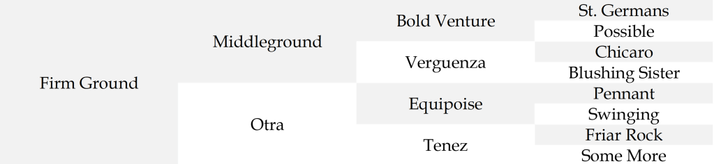 Otra, the dam of Firm Ground, was bred by Greentree Stable in Kentucky. She was by Equipoise and out of Tenez, by Friar Rock. Otra was purchased by the King Ranch and, like Middleground, was trained by Max Hirsch. She won two races and placed second in the 1939 Pimlico Oaks. In 1940, Otra was bred to Bold Venture. Her first foal, Morani, was a race winner as were her foals Retama, Armagh and Renewal. By 1957, Otra had sold to Harold Kitchen in Kentucky. Under his ownership, she produced Chocolate Beau, winner of the 1960 Ohio Valley Stakes. She also produced race winners Bonnie Google and Judge Joe W. Otra produced her last foal when she was 24 years old. Altogether, she produced twelve Jockey Club registered foals. Her daughters produced stakes winners Bonnie and Gay, Big Felly, Lady Offshore, Resaca, Satin Gold and Tamarona. Notably, Otra is the fourth dam of 1986 British Horse of the Year, Dancing Brave.