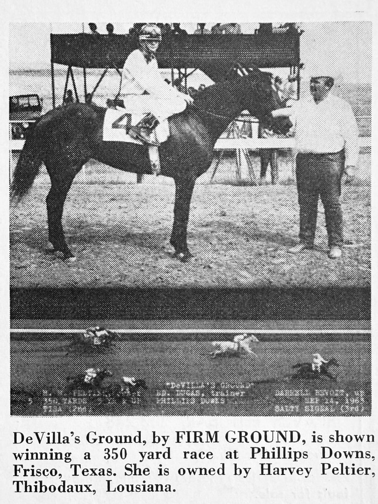Firm Ground was unraced. He stood at Forman Farms in Anton, Texas. His first foals were born in 1956. Jet Charge, the best Thoroughbred starter by Firm Ground, won three races and placed third in the 1962 Ruidoso Thoroughbred Derby. Davilla’s Ground, his best Quarter Horse starter, placed second in the 1963 Autumn Live Oak Derby. His Quarter Horse foals Firm Deck, Grounded, Prince Ground, Caviar and Firm Arrow earned Racing Register of Merits. Playground, a black mare by Firm Ground and out of Blue Babe Wheeler, earned performance points. Altogether, Firm Ground sired 110 Thoroughbred and Quarter Horse foals in fifteen foal crops. They had earnings of $216,465 on the track.