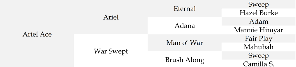 War Swept, the dam of Ariel Ace, was an unraced daughter of the legendary Man o’ War. She was a full-sister to National Show Hunter Hall of Fame inductee Holystone. War Swept produced thirteen foals for Mereworth Farm, including race winners Go Again, Clivia, Parla and Goddess Gold. Her best starter, Roman Bath, won three stakes races. Roman Bath later sired Thoroughbred stakes winner Andrew Road, as well as eight AQHA recognized foals. Music Man Fox, anther black-type stakes winner out of War Swept, sired Some Kinda Music, another Thoroughbred sire of Quarter Horses. Air Cobra, a full-brother to Ariel Ace, also sired 47 AQHA recognized foals. War Swept produced her last foal, General Quarters, in 1958 when she was 22 years old.