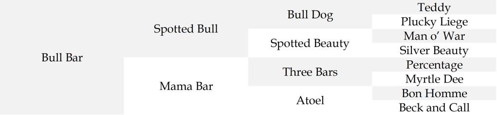 Mama Bar, the dam of Bull Bar, was a Thoroughbred daughter of Three Bars. She was out of Atoel, a stakes-placed Thoroughbred mare that set a World Record at three furlongs. Atoel was a leading Thoroughbred dam of Racing ROM earners. Like her mother, Mama Bar was also a noteworthy producer. Bull Bar was her first foal. She then sold to L. E. Patterson in California where she produced four Thoroughbred foals, including race winners Spotted Mama and Senor Win. Patterson also bred Mama Bar to the Quarter Horse stallion Clabber’s Win. The resulting foal, Triple Win, was a race winner. Mama Bar produced her last three foals for J. E. Reimers & Son. They bred race winners Moolah Mama and The Butler. Mama Bar produced her ninth and final foal in 1968.