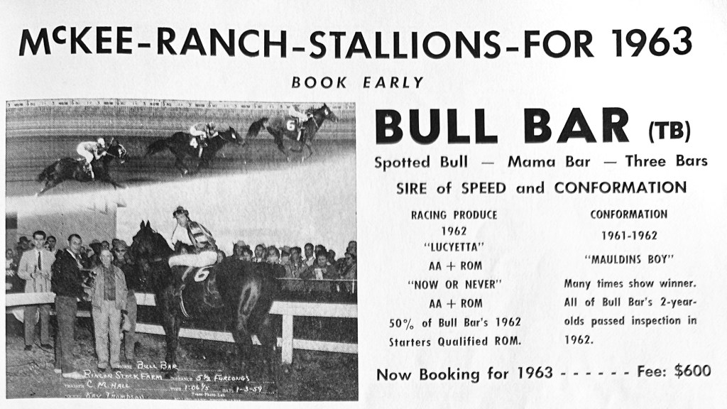 Bull Bar’s last foals were born in 1966 when he would have been twelve years old. He still appears in the pedigrees of some racehorses and halter horses today.