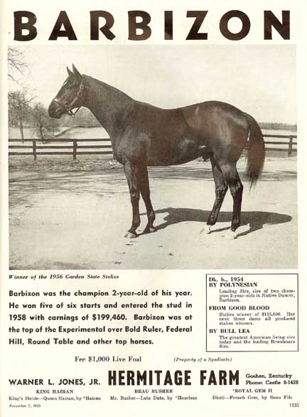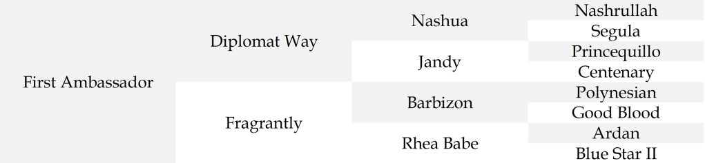 Fragrantly, the dam of First Ambassador, was by Barbizon, the 1956 Champion Two-Year-Old Colt and the damsire of Raise Your Glass. Fragrantly made ten starts and won one race. Her first foal, Feloniously, won the 1972 Hawthorne Derby Handicap. Fine Aroma, a full sister to First Ambassador, won the 1980 Bornastar Stakes. She went on to produce Perfection, winner of the 1993 Banyan Handicap. Fine Diplomacy, another full-sister of First Ambassador, produced Prospector’s Gold, a sire of 173 AQHA recognized foals. Other race winners out of Fragrantly included Felonious Assault, Famed Ambassador and Fine Fellow. Her daughter Fine Fragrance produced Thoroughbred stakes winners Fragrant Princess, Mystic Obsession and Ship Liner. In total, Fragrantly produced fourteen Thoroughbred foals for Farnsworth Farm. Her last foal, Redolence, was foaled in 1986 when she was 22 years old.