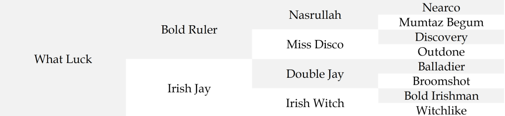 Irish Jay, the dam of What Luck, was a third-generation Wheatley Stable bred mare. She was by Double Jay and out of Irish Witch, by Bold Irishman. Irish Jay was a high-class racehorse. She won seven races, including the Schuylerville Stakes, Fashion Stakes, Demoiselle Stakes, Spinaway Stakes, Comely Stakes and Acorn Stakes. Irish Jay produced eleven foals for Ogden Phipps and Wheatley Stable. Her first seven foals were by Bold Ruler. Queen Empress, her first foal, was the 1964 Champion Two-Year-Old Filly. Irish Jay also produced multiple stakes winner King Emperor and graded stakes winner Land of Eire. They were both successful sires as was her race-winning son The Irish Lord. Irish Jay’s last foal, Dublin, was born in 1979 when she was 22 years old.