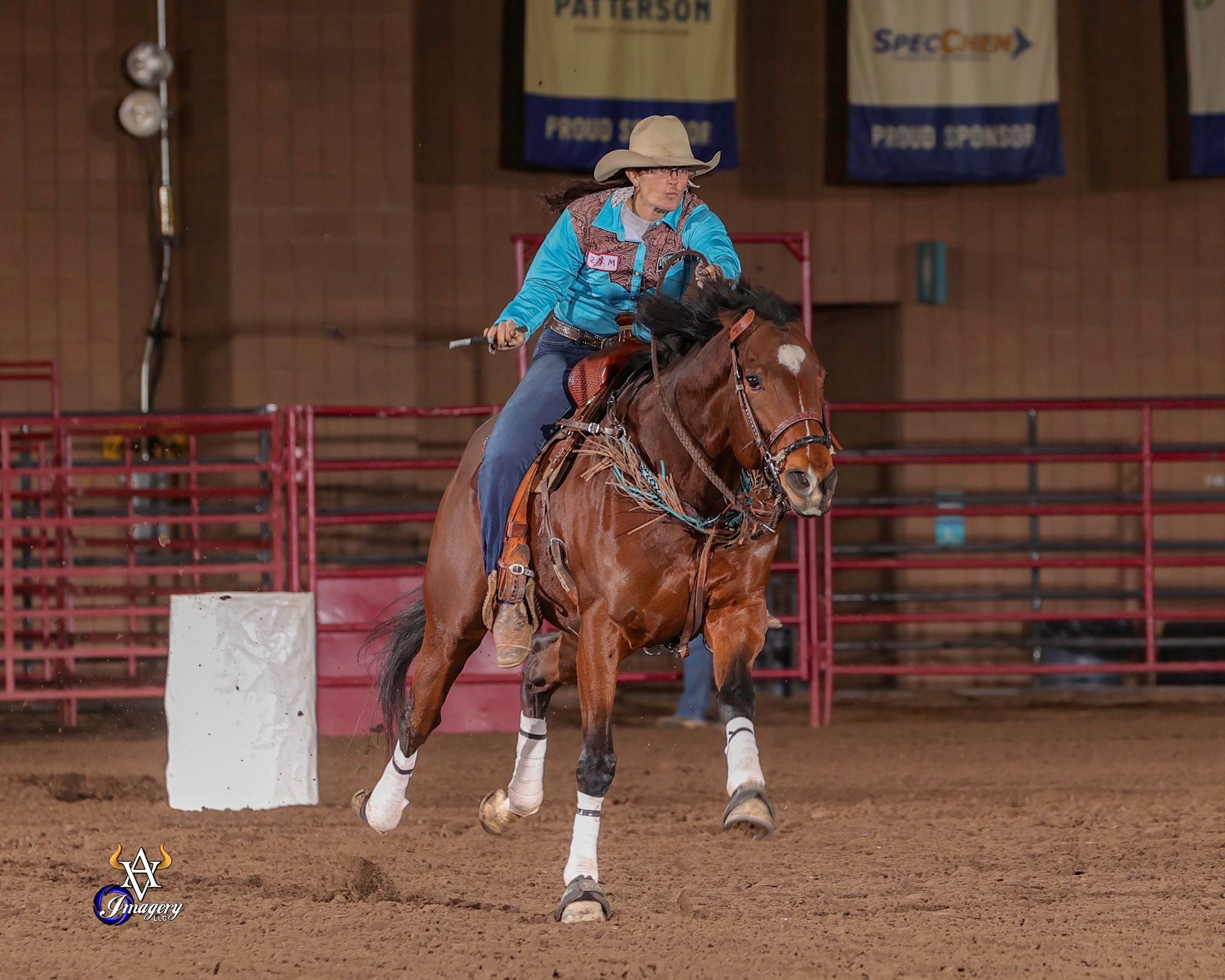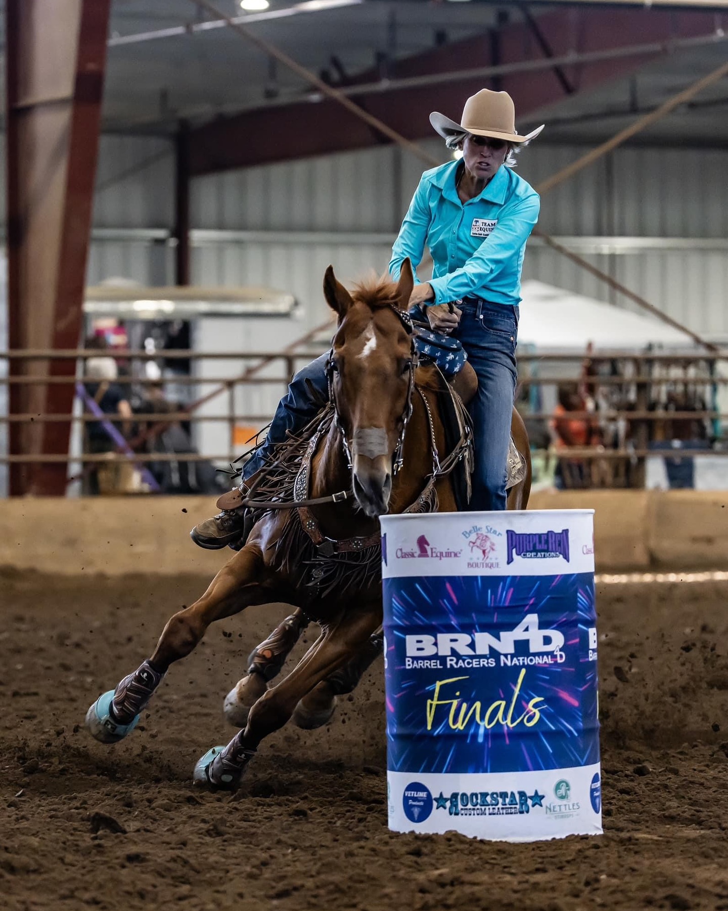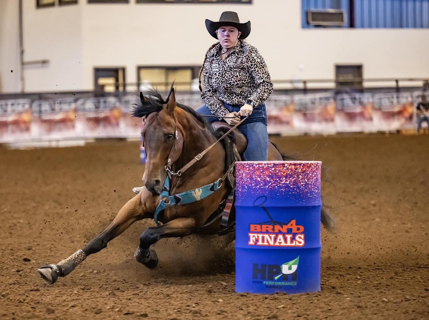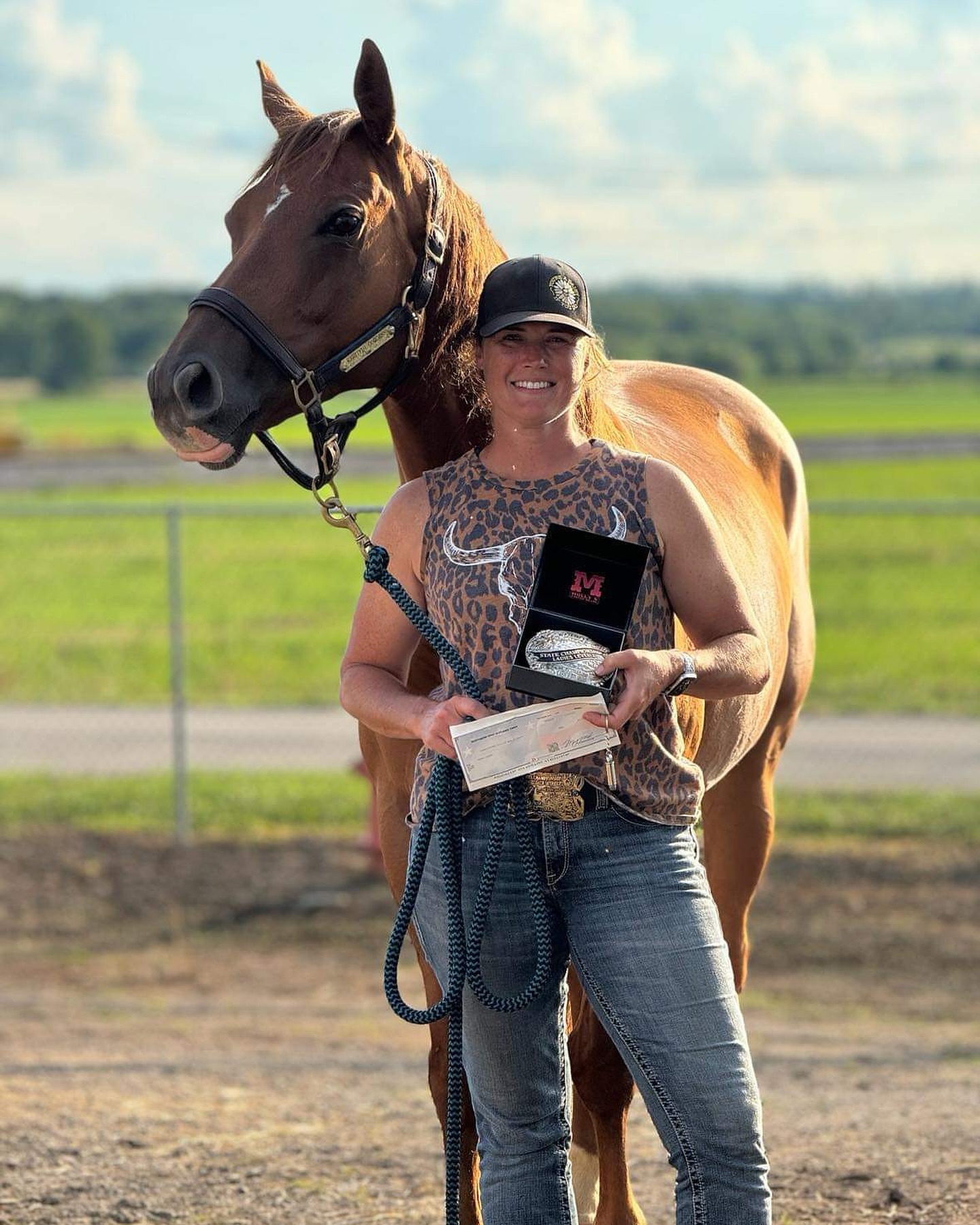 Melanie McKay lives in Kansas with her husband, son, and herd of barrel racing horses. She began barrel racing in 4-H as a child and now competes in rodeos and barrel races across the Midwest. Melanie serves as a district director in the National Barrel Horse Association and offers training services for horses and riders as part of 2M Equine with her husband. She is a nine-time qualifier to the Interstates Rodeo Association Finals, a two-time United Rodeo Association Finals qualifier, nine-time NBHA district 1D champion, two-time Kansas NBHA reserve champion, and was the 2017 URA Finals champion. She currently rides two OTTB mares – Hope N Wishes and Buca Sarabi. Hope N Wishes is her main rodeo horse and placed in two rounds and the average at the 2024 IRA Finals Rodeo.