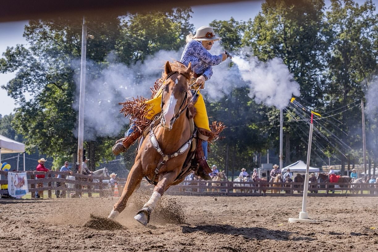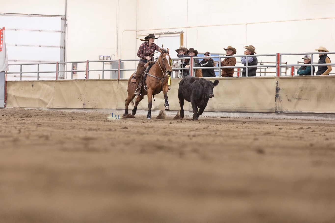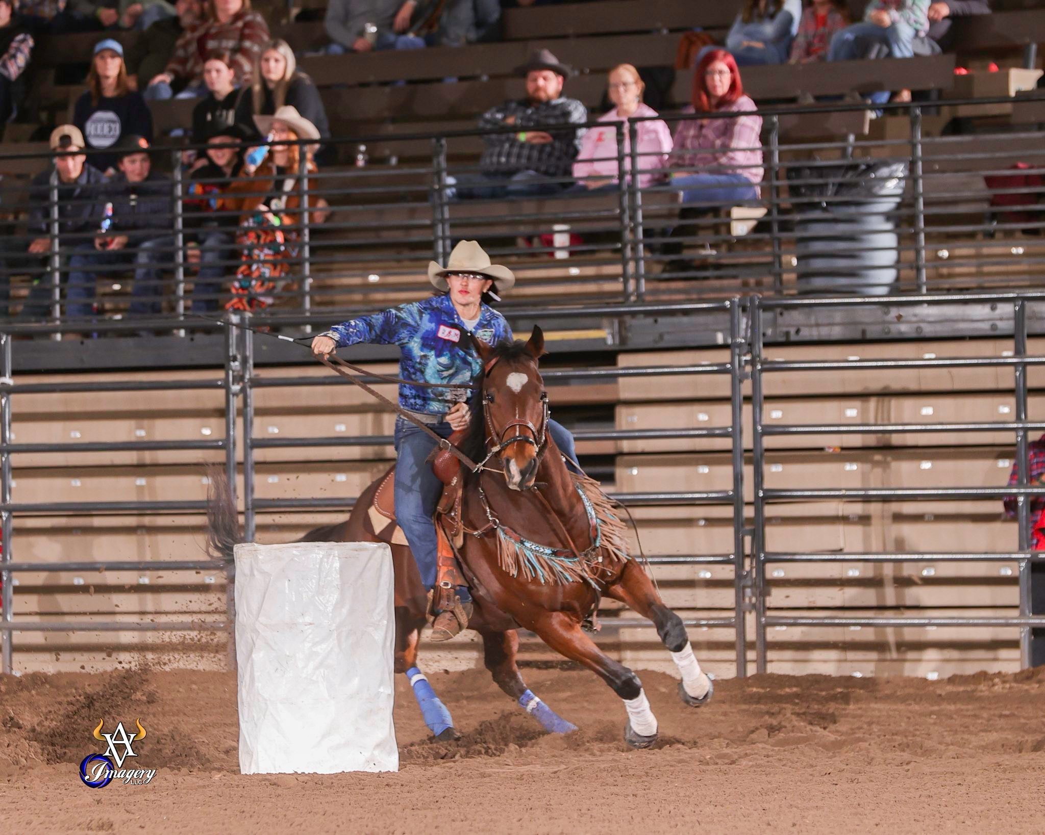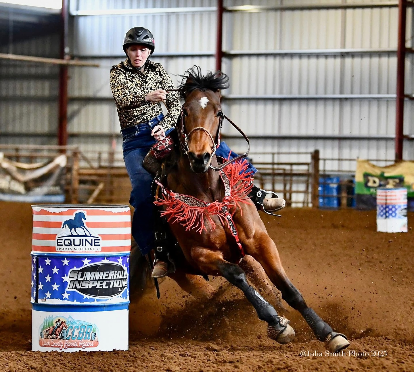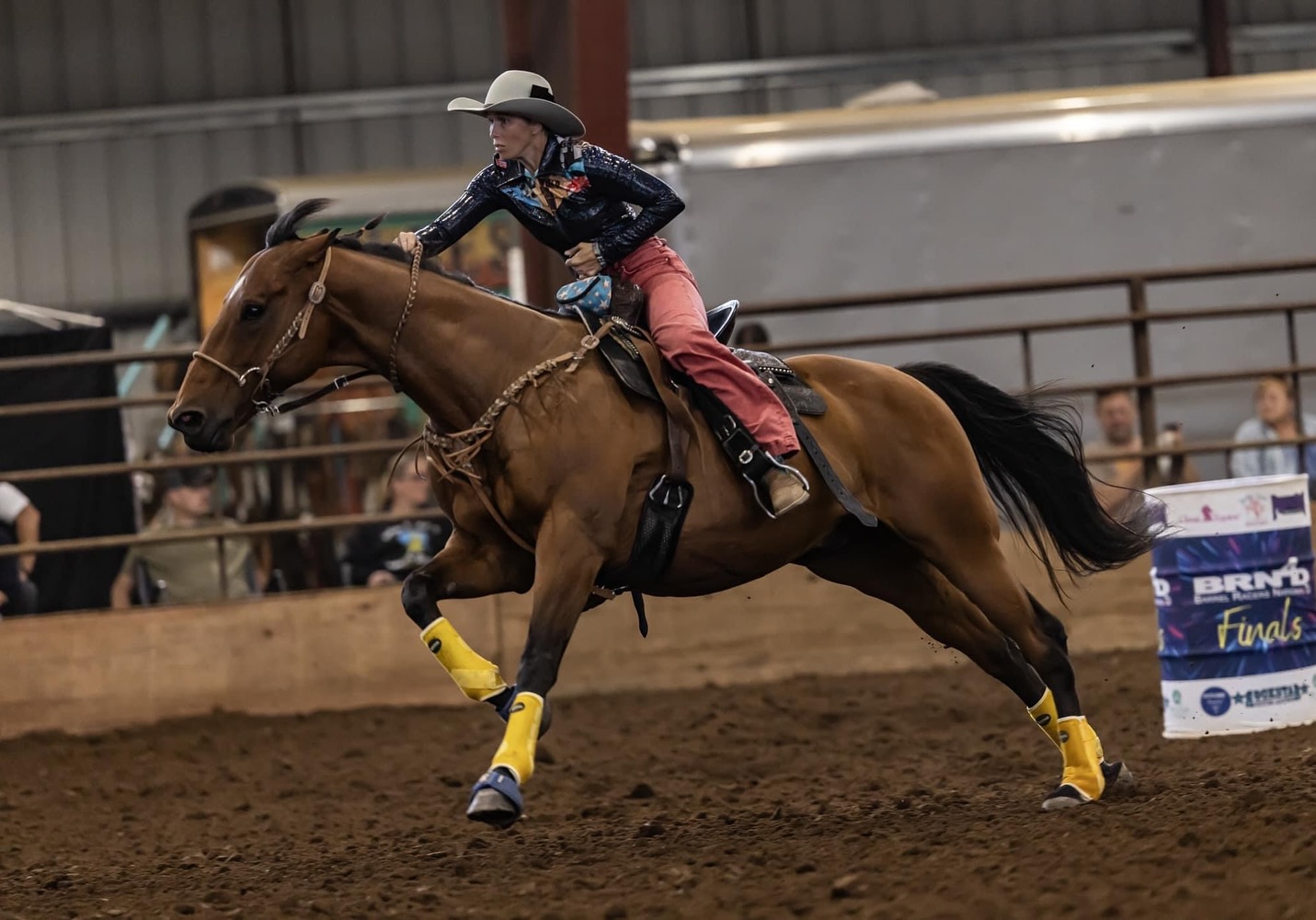 Melanie McKay lives in Kansas with her husband, son, and herd of barrel racing horses. She began barrel racing in 4-H as a child and now competes in rodeos and barrel races across the Midwest. Melanie serves as a district director in the National Barrel Horse Association and offers training services for horses and riders as part of 2M Equine with her husband. She is a nine-time qualifier to the Interstates Rodeo Association Finals, a two-time United Rodeo Association Finals qualifier, nine-time NBHA district 1D champion, two-time Kansas NBHA reserve champion, and was the 2017 URA Finals champion. She currently rides two OTTB mares – Hope N Wishes and Buca Sarabi. Hope N Wishes is her main rodeo horse and placed in two rounds and the average at the 2024 IRA Finals Rodeo.