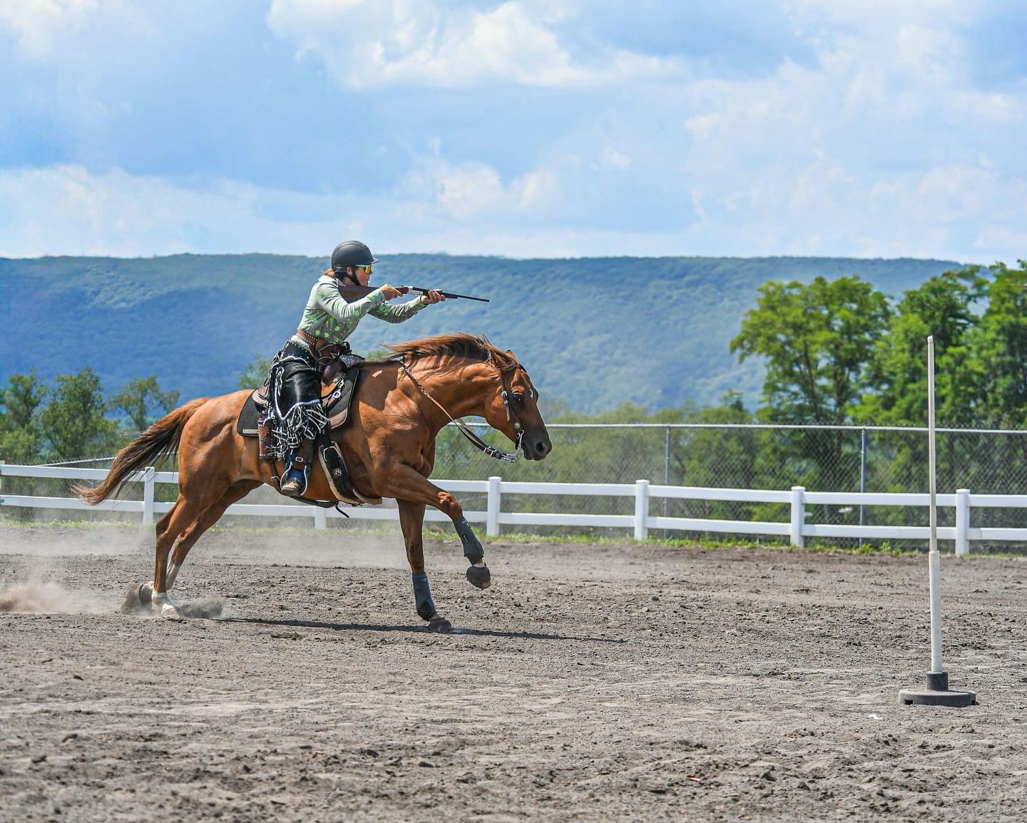 Marcella Gruchalak is a Pennsylvania cowgirl that contributes many of her successes in mounted shooting to her OTTB, Funny Bunny B., aka “Buns.” Marcella originally bought Buns as a resale project for the 2017 Retired Racehorse Project Thoroughbred Makeover. She was sure that she would sell the chestnut OTTB gelding at the Makeover as he was not what she thought she wanted in a forever mount. However, while working with him, she realized he was a once in a lifetime horse that truly embodied the special characteristics of the Thoroughbred breed. When the time came to list him with the Thoroughbred Makeover, Marcella declined. Over the years, the two moved up the ranks in the Cowboy Mounted Shooting Association from Ladies Level 1 to Ladies Level 4, earning many titles and accolades in the sport.