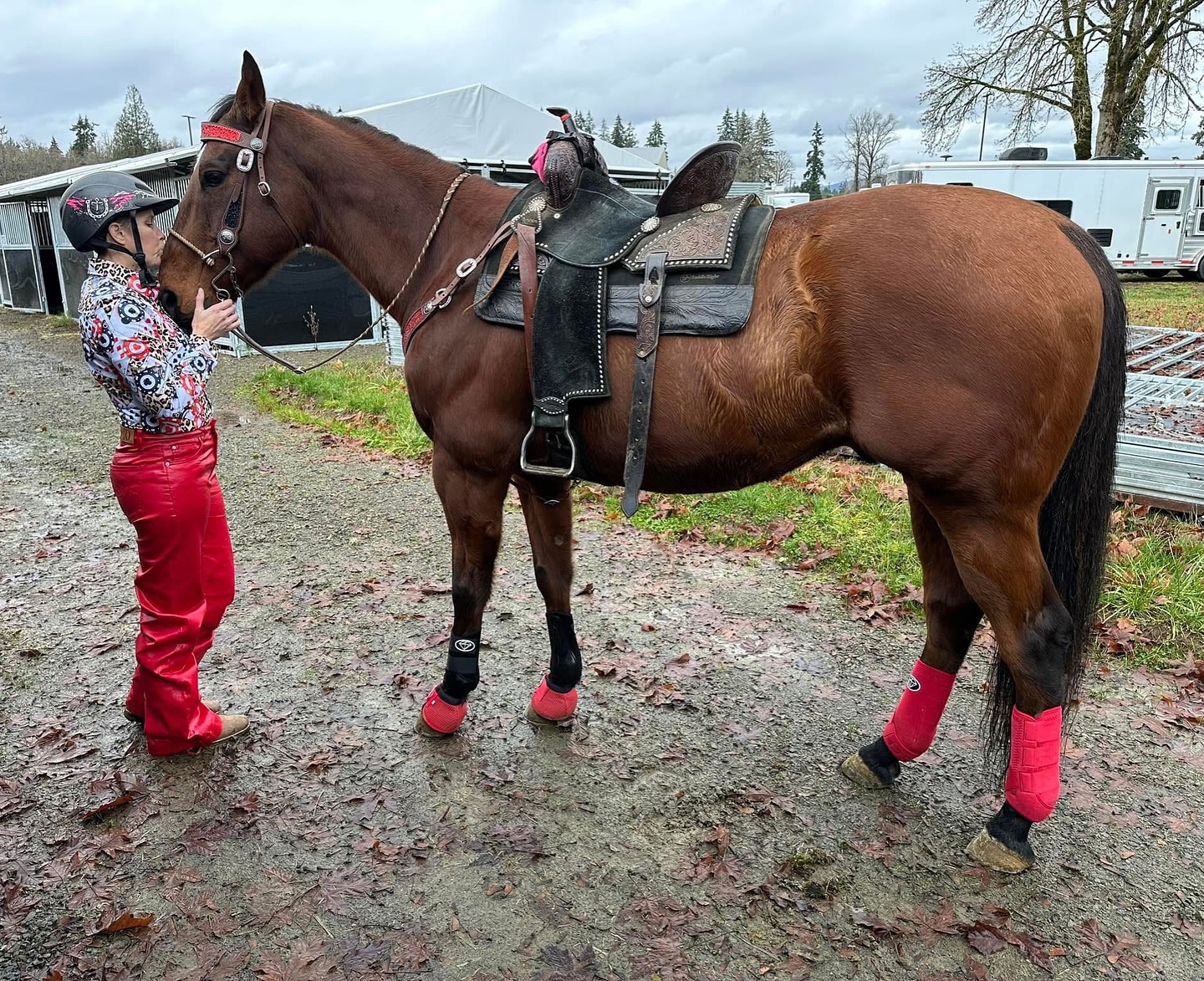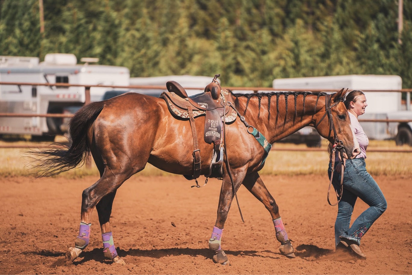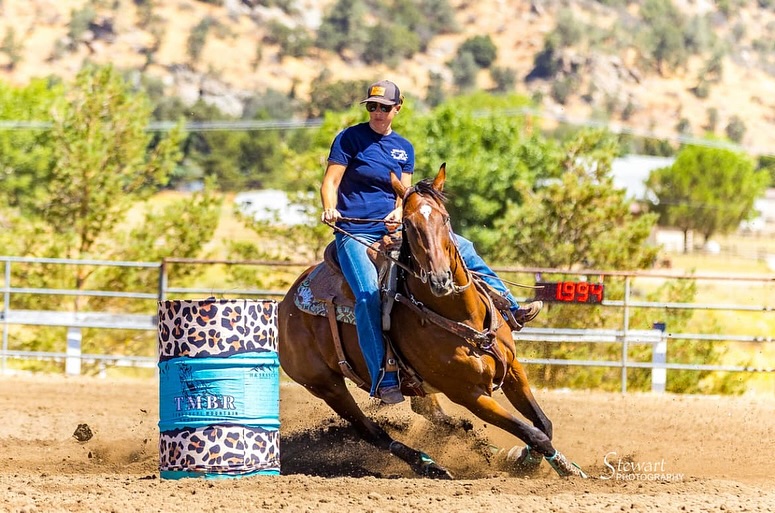 Mallory’s OTTB mare Heavens Eagle, aka “Sriracha,” was too slow to make a start at the track. Mallory trained Sriracha for barrel racing and they accomplished a lot together. They were the Pacific Coast Barrel Racing Association reserve champions in 2017 and champions in 2020. Mallory’s daughter, Kayla, is running Sriracha now.
