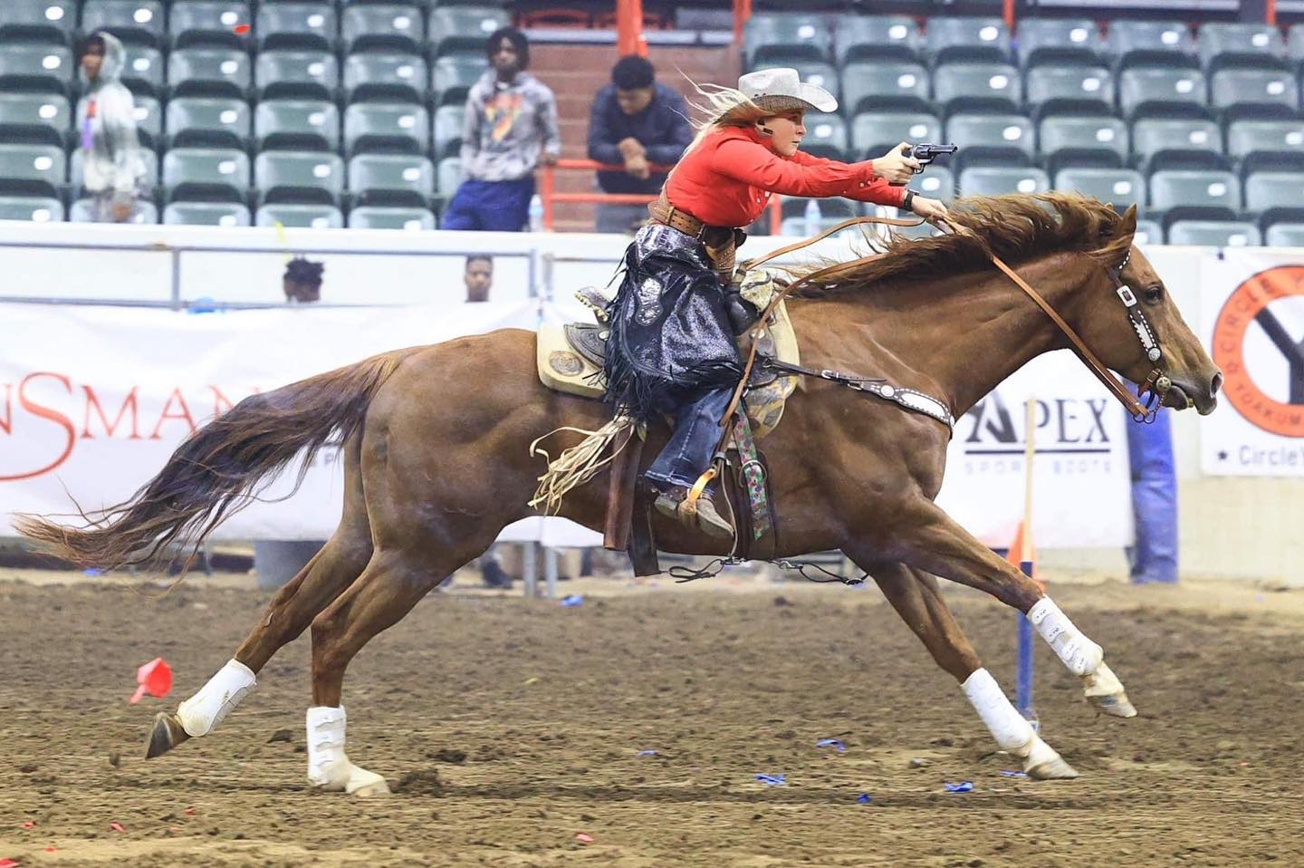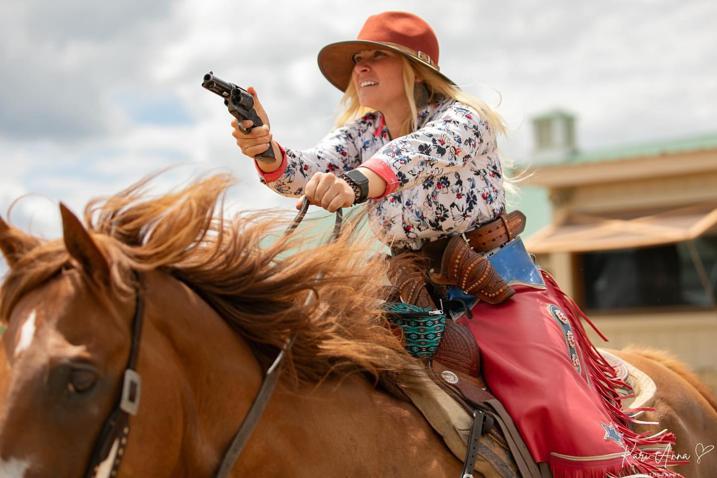 When she isn’t competing in mounted shooting, Marcella likes to pack up the trailer and take her horses on trail riding trips. She likes trail riding to decompress herself and her horses from the high demand of competition. She’s enjoyed trails and campgrounds in many different states but her favorite trip was to Love Valley, North Carolina.